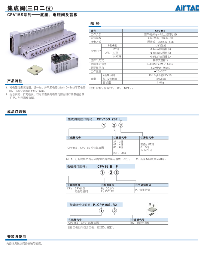 集成閥(三口二位)CPV15S系列底座電磁閥及盲板